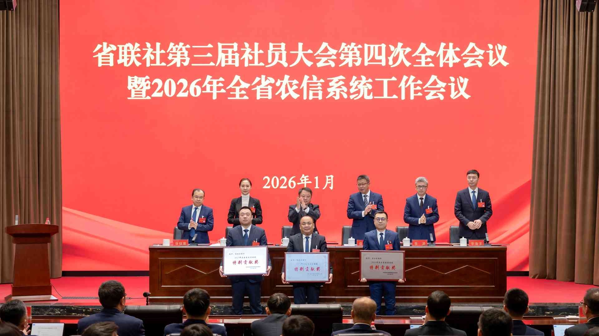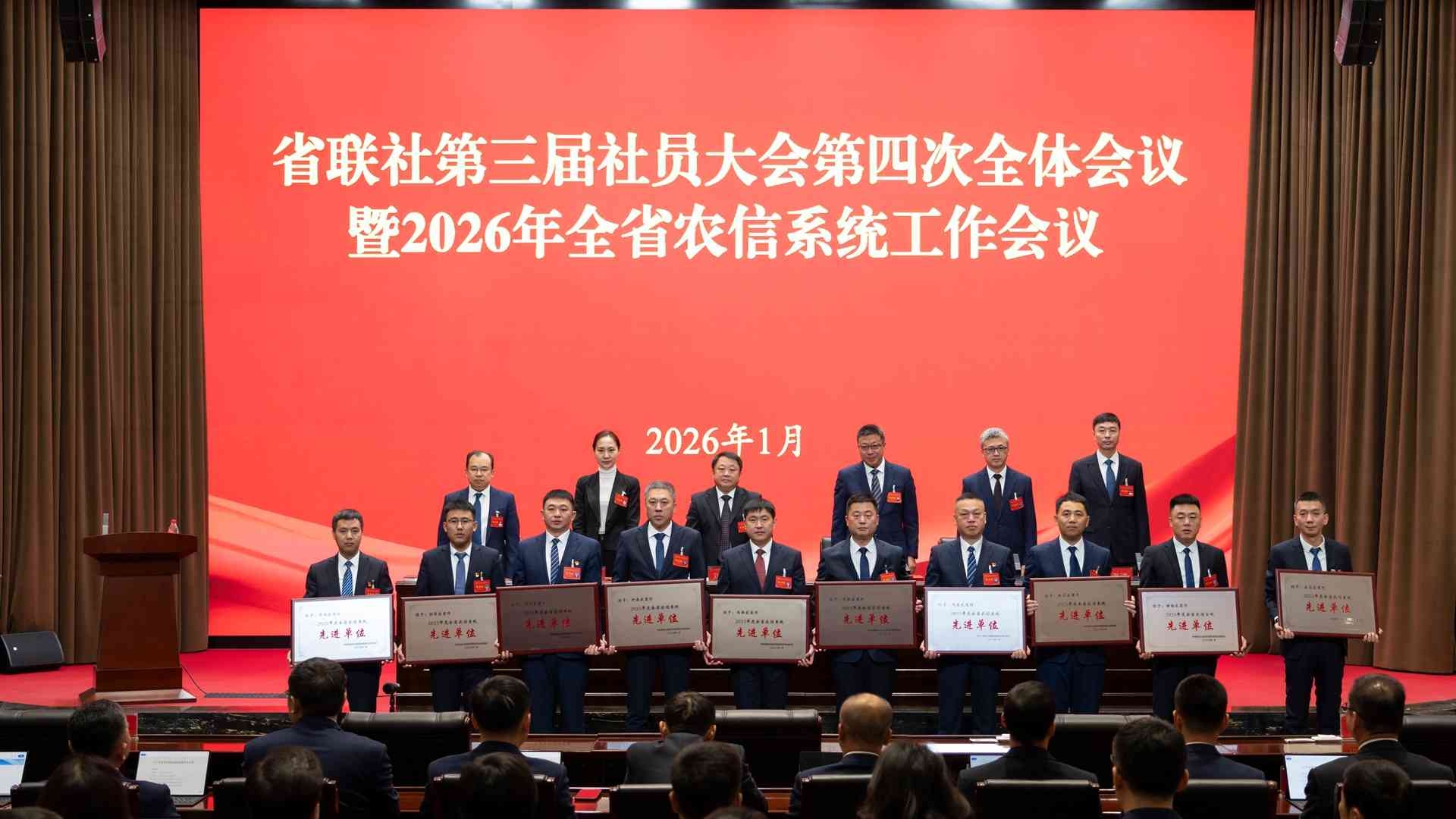 1月30日,省联社召开第三届社员大会第四次全体会议暨2026年全省农信系统工作会议,全面总结2025年工作,深入分析当前形势,研究部署2026年工作,隆重表彰2025年度先进单位和先进个人,3家法人行社作会议发言,综合计划部负责人作2025年度经营分析报告,省联社党委书记、理事长刘长旭作工作报告,省联社党委副书记、主任盛象斌主持会议。