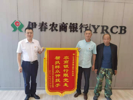 6月22日,南岔县浩良河镇小吉星村村书记杨春晶和五保户张文远满怀激动地将一幅绣有“农商银行跟党走,帮扶群众伸援手”的锦旗送到了伊春农商银行第六党支部。